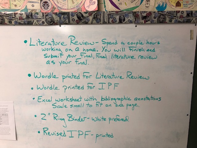 I hope you and your families are all safe and sound. We enter the third week of remote instruction with some clearer direction - no Capstone Presentation this year, we will not return in April, and your papers are all heading in the right direction. This week, you will continue to focus on your papers. Last week each of you should have received an individual email with guidance on how to proceed and feedback on a variety of elements. Deadlines for this work were assigned based on when I was able to complete the feedback process (March 30 for some, April 1 for others, April 2 for a couple).