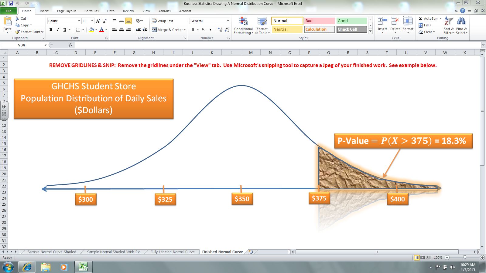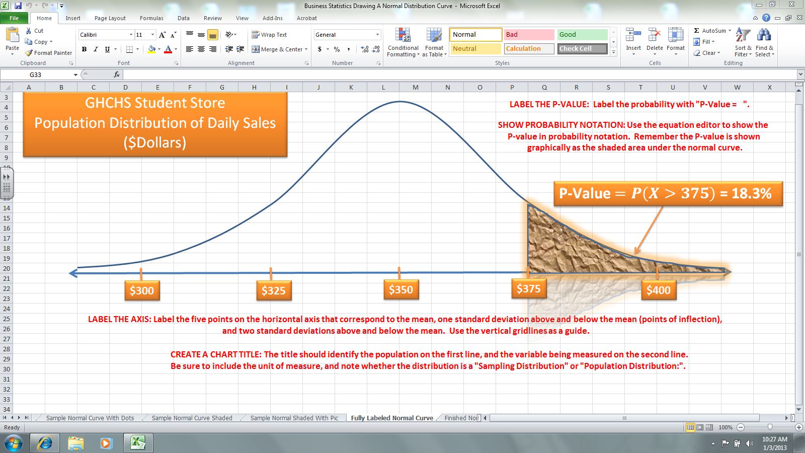 On Thursday, we reviewed calculating probability from normal population and sampling distributions. We learned how to draw a normal curve using Excel, and then shade a given probability region. This Excel workbook was examined in class. Its six worksheets sequentially guide students through the process of drawing a normal curve with Excel, shading a probability region, and fully labeling the resulting diagram..